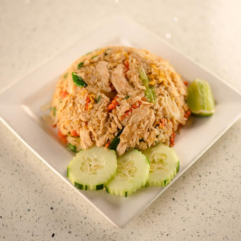 Thai fried rice is stir-fried rice with tomatoes, onions, scallions, carrots, eggs and garlic with soy sauce.