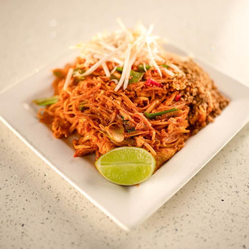 Pad Thai is stir-fried rice noodles with bean curd, bean sprouts, green onions, sweet radish, egg, and peanuts.