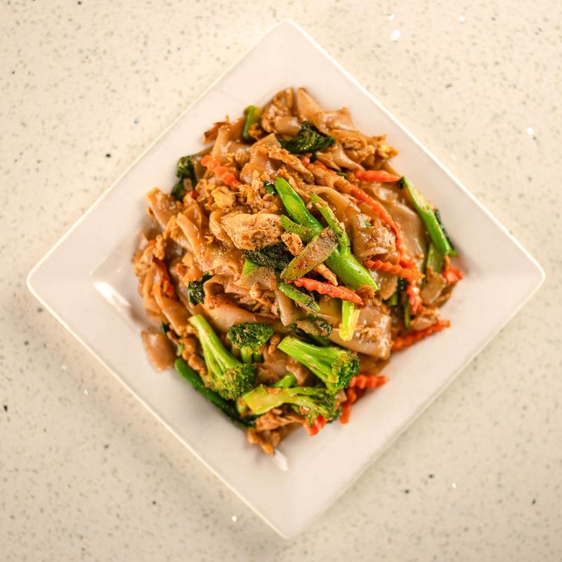 Pad see ew is stir-fried flat rice noodles, egg, carrot, and Chinese broccoli with sweet soy sauce.