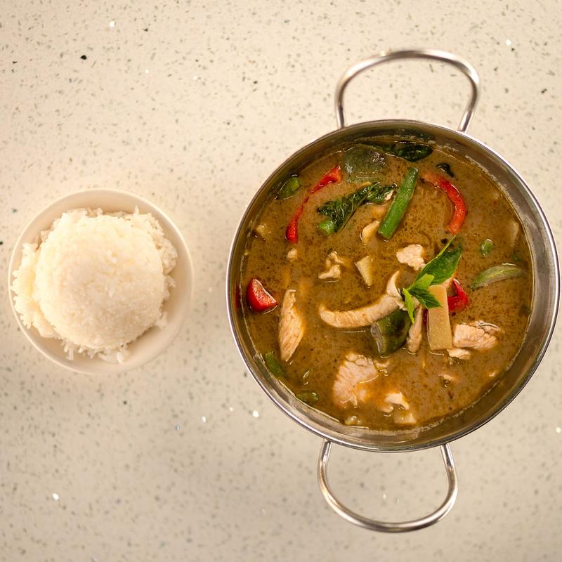 Panang curry paste, kaffir lime leaf, peanut butter, and coconut milk with steamed vegetables.